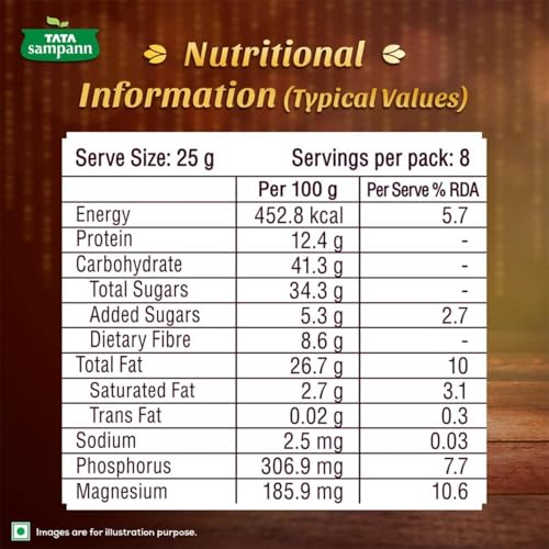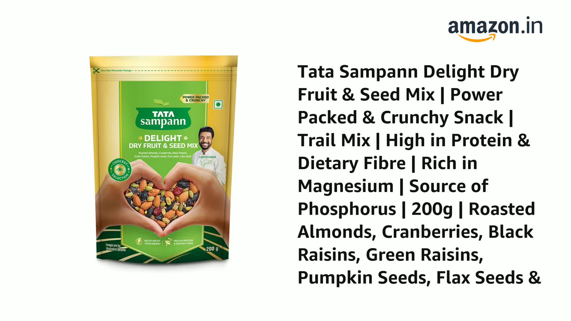 Snack On Power-Packed & Crunchy Dry Fruit & Seed Mix! Indulge in the irresistible delight of Tata Sampann Delight Dry Fruit & Seed Mix. Enjoy the delicious power-packed and crunchy snacking options for you. This mix of dry fruits & seeds undergo 20+ quality parameter checks to ensure you get only the premium quality. Snack on this delicious dry fruit and seed mix that is high in Protein & Dietary Fibre rich in Magnesium and a source of Phosphorus. The nuts and seeds mix consists of Roasted Almonds Cranberries Black Raisins Green Raisins Pumpkin Seeds Flax Seeds & Chia Seeds that help boost your energy. Enjoy this protein-rich snack for breakfast mid-day snacking or on-the-go snacking. Elevate your snacking game with Tata Sampann Delight Dry Fruit & Seed Mix today! Storage Instructions: Store in a cool and dry place. Store away from direct heat or sunlight.