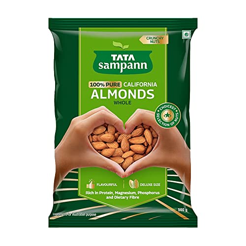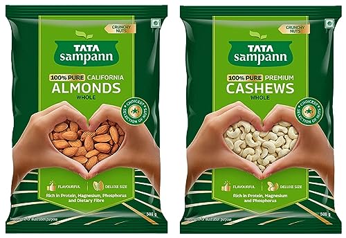 Tata Sampann Pure California Almonds Whole | Premium Badam Giri | Rich in Protein Magnesium Phosphorus and Dietary Fibre | Premium Nuts & Dry Fruits | 500gTata Sampann 100% Pure California Almonds Tata Sampann brings you a whole range of premium dry fruits nuts and raisins for a wholesome snacking experience. With the choicest selection of nuts Tata Sampann 100% Pure California Almonds are grown and harvested in California. Tata Sampann dry fruits go through up to 20 quality parameters to deliver the choicest selection of nuts. Good choice for your well-being Packed with the goodness of protein magnesium phosphorus and dietary fibre Tata Sampann badam are a good choice for your well-being. They are rich in dietary fibre which is generally known to be an essential part of a healthy & balanced diet. Rich in protein magnesium and phosphorus all of which contribute to maintenance of normal bones. So satiate yourself guilt-free with this fulfilling snack or share it with your loved ones. Happy snacking! Turn your snack time delicious and wholesome with these crunchy and flavourful nuts. They are perfect to curb your hunger in between meals and make for a great addition to your diet. Add these almonds to your cooking practices and upgrade your favourite dishes to yummy delights.Tata Sampann Pure Cashews Whole | Premium Kaju | Rich in Protein Magnesium and Phosphorus | Premium Nuts & Dry Fruits | 500gTata Sampann 100% Pure Premium Cashews Tata Sampann brings you a whole range of premium dry fruits nuts and raisins for a wholesome snacking experience. Made from the choicest selection of nuts Tata Sampann 100% Pure Premium Cashews are worth savouring. Tata Sampann dry fruits go through up to 20 quality parameters to deliver the choicest selection of nuts. Good choice for your well-being Packed with the goodness of protein magnesium and phosphorus Tata Sampann kaju are a good choice for your well-being. Rich in protein magnesium and phosphorus all of which contribute to maintenance of normal bones. So satiate yourself guilt-free with this fulfilling snack or share it with your loved ones. Happy snacking! Turn your snack time delicious and wholesome with these crunchy and flavourful nuts. They are perfect to curb your hunger in between meals and make for a great addition to your diet. Add these cashews to your cooking practices and upgrade your favourite dishes to yummy delights.
