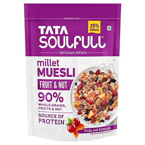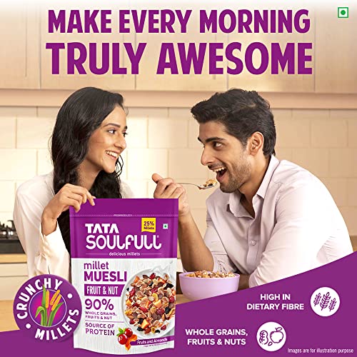 There are two kinds of mornings the good ones and the bad ones. We've just discovered a third kind- the awesome ones. Muesli is great for health but the goodness of Millets makes Tata Soulfull Millet Muesli awesome for health. The crunchy muesli with almonds keeps your taste buds happy and the real fruits keep your body delighted. So go ahead. Try the secret of making every morning truly awesome. Store away from direct heat and sunlight.
