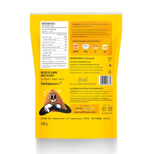 Naturally Pure & Fresh: Free from additives preservatives and artificial flavors ZOFF Almonds offer nothing but pure natural goodness. Each batch is hygienically packed in air-tight packaging to retain maximum freshness flavor and crunch