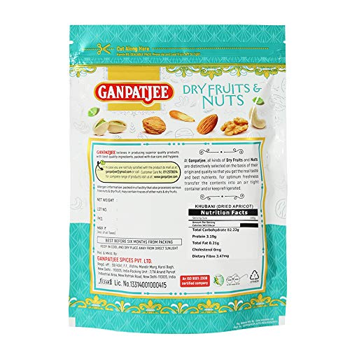 About GanpatjeeGanpatjee believes in superior quality products with the best quality ingredients packed with due care and .Dried Apricots Khubani 250 grams Ganpatjee Khubani is distinctively selected on the basis of its origin and quality so that you get the real taste and best nutrients. Apricots keep the immune system in check protecting your skin in the process. Apricots are an excellent source of potassium and iron. Eat some Dried Apricots at least once a day to stock up Vitamin K in your body. Known to be rich in its nutritional value. It contains Vitamin A Vitamin C Calcium Iron Potassium and Phosphorus. It is mesmerizing to have so many proteins in just this one snack. They are high in vitamin C which helps in iron absorption. Dried apricots are consumed before a meal to stimulate digestion. Dried apricot are excellent sources of dietary fibre they're especially rich in soluble fibre The fruit dissolves in the body easily and the important nutrients are easily absorbed by the system. They help boost your health and are essential for beautiful skin hair and blood building.Product Specifications:Product: Dried Apricots Khubani Quantity: 250 gm Ingredients: Khumani Product FeaturesServe it in Indian Meals like Desserts Pudding Cakes etc. Vegetarian Product! No Artificial colours and No additivesPackage Includes:1* Dried Apricots Khubani 250 grams