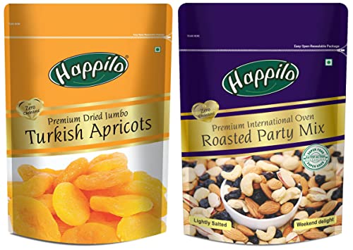 Happilo Dried Premium Turkish Apricots 200gHappilo has travelled the world to get the finest gourmet dry fruits. They are one of the most nutritious dried fruits in the world they're a yummy healthy snack. Great for Snacking adding to Cereal Cooking and Baking. High Antioxidants Dietary Fiber No Gluten Non GMO Zero Trans Fat & Zero Cholesterol. Daily need products for a healthy and energetic life. Happilo Zip Lock Pouch with airtight seal to ensure the product is protected and fresh. Quality assured - Happilo products are rigorously tested against the industry's best quality standards.Happilo Premium International Salted Partymix 200g Dry FruitsConfused of which nuts to take in your diet? Looking for premium mixed nuts that are just slightly salted? These are for you! Switch to Happilo Salted Nutmix with ultra healthy combination of dry fruits which give you your daily intake of nutrients. Time to be happy lovely and healthy.