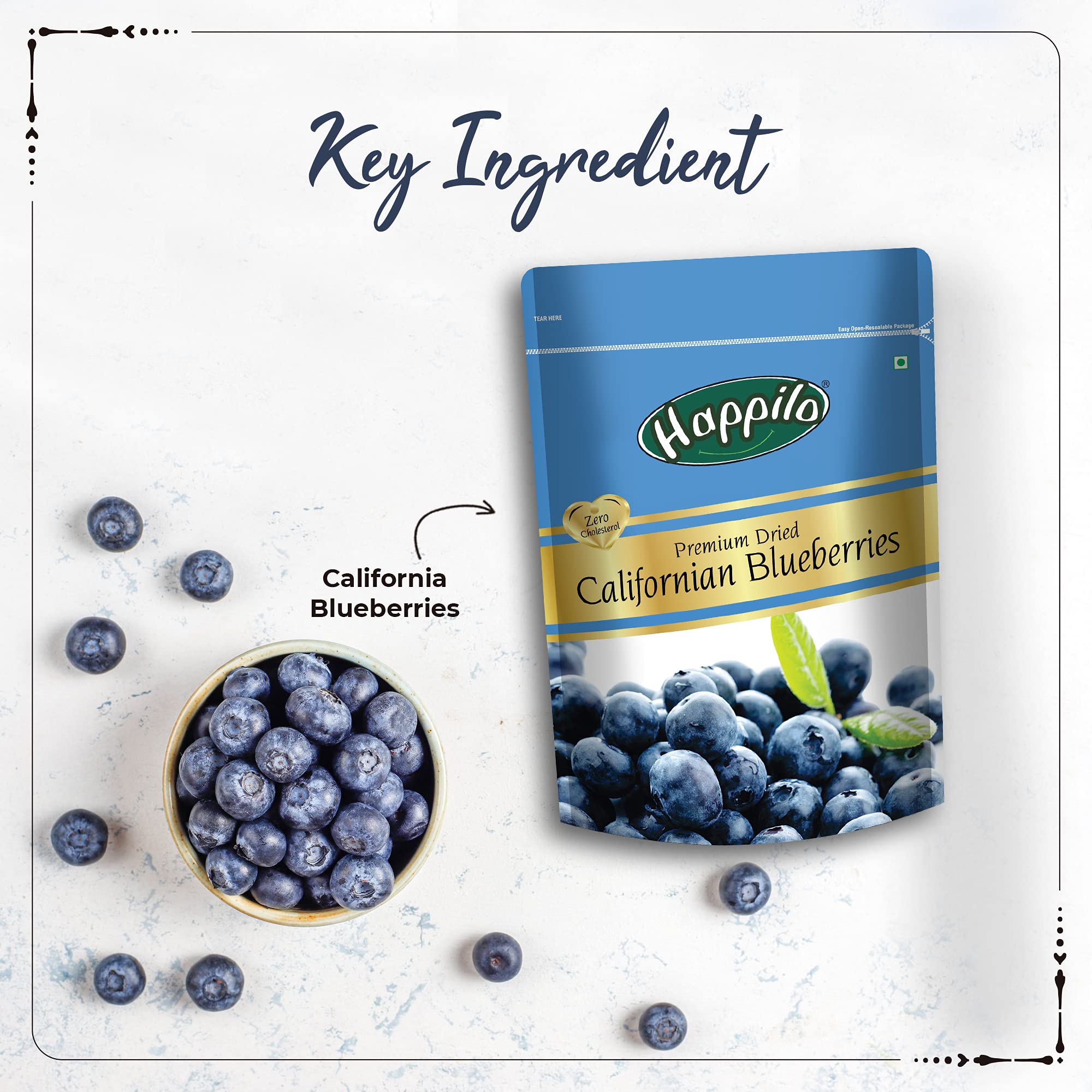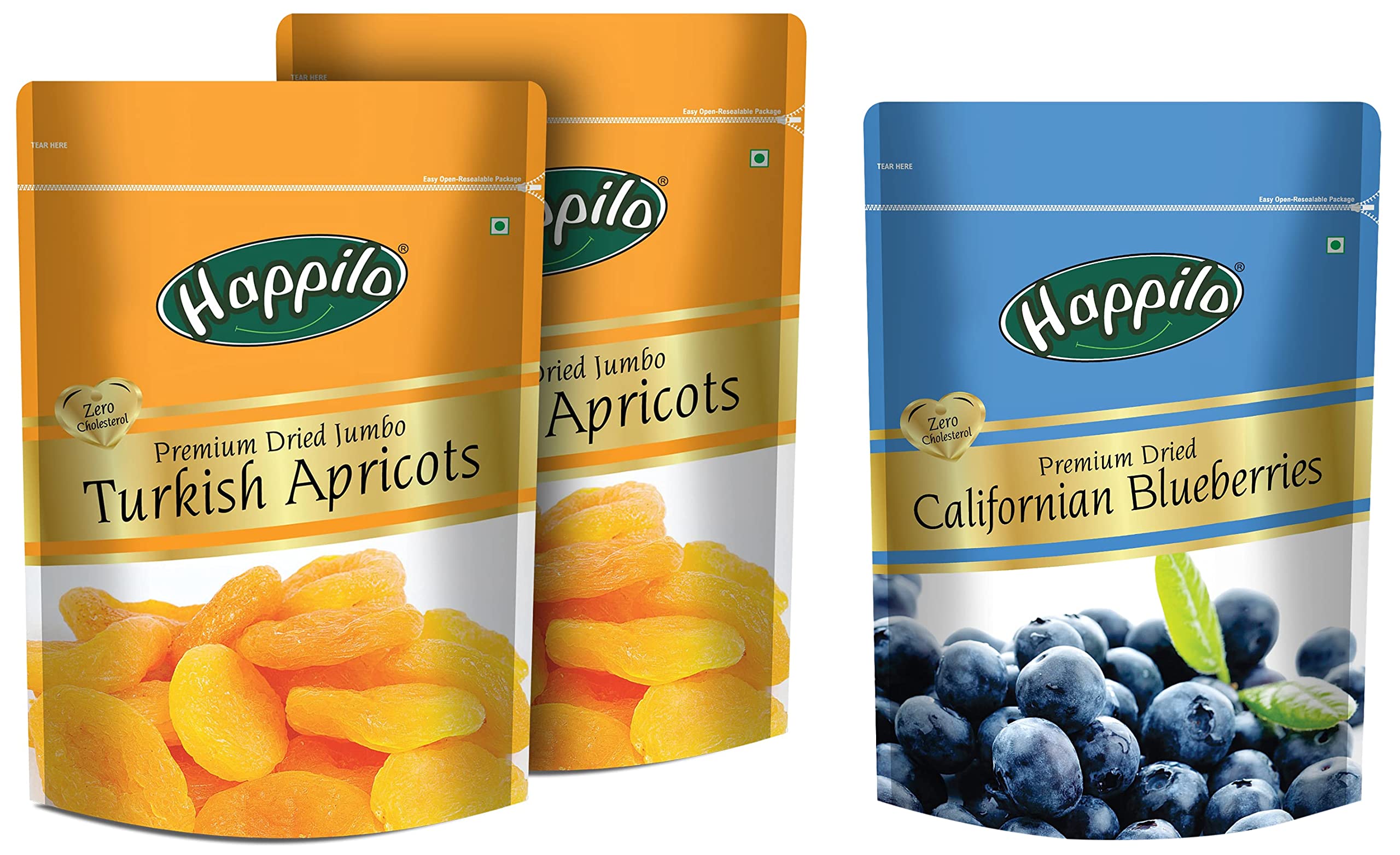 Happilo Premium Dried Californian Blueberries 150 g (Pack of 1)Happilo has travelled the world to get the finest gourmet dry fruits Dried Blueberries are the original candy- nature's candy. They are one of the most nutritious dried fruits in the world. famous for their sweetness so they're a yummy healthy snack. They have double the deliciousness of ordinary dried blueberries. Great for Snacking adding to Cereal Cooking and Baking. High Antioxidants Dietary Fiber No Gluten Non GMO Zero Trans Fat & Zero Cholesterol. Daily need products for a healthy and energetic life. Happilo Zip Lock Pouch with airtight seal to ensure the product is protected and fresh. Quality assured - Happilo products are rigorously tested against the industry's best quality standards.Happilo Premium Jumbo Turkish Apricots 200g (Pack of 2)Happilo has travelled the world to get the finest gourmet dry fruits. They are one of the most nutritious dried fruits in the world they're a yummy healthy snack. Great for Snacking adding to Cereal Cooking and Baking. High Antioxidants Dietary Fiber No Gluten Non GMO Zero Trans Fat & Zero Cholesterol. Daily need products for a healthy and energetic life. Happilo Zip Lock Pouch with airtight seal to ensure the product is protected and fresh. Quality assured - Happilo products are rigorously tested against the industry's best quality standards.