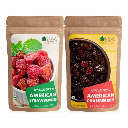 Bliss of Earth Dried Strawberries are handpicked from the United States of America. These berries are natural and delightful dried berries that are an excellent source of antioxidants. Also rich in vitamin A & C and fibre Strawberries offer anti-inflammatory properties helping in muscle recovery. Unlike many other dry fruits these berries are extremely versatile in their use. Dried strawberries are a culinary ingredient that will help you produce a variety of great dishes.Bliss of Earth Dried Whole Cranberries are handpicked from the United States of America. These berries are natural and delightful dried berries that an excellent source of antioxidants Also rich in vitamin K&c and fiebre cranberries offer a daily dose of nutrients. Unlike many other dry fruits these berries are extremely versatile in their use. Dried cranberries are a culinary ingredient that will help you produce a variety of great dishes.