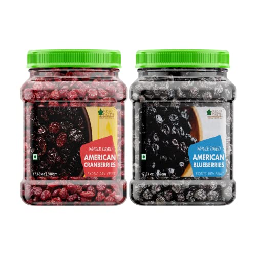 Bliss of Earth Dried Whole Cranberries are handpicked from the United States of America. These berries are natural and delightful dried berries that an excellent source of antioxidants Also rich in vitamin K&c and fiebre cranberries offer a daily dose of nutrients. Unlike many other dry fruits these berries are extremely versatile in their use. Dried cranberries are a culinary ingredient that will help you produce a variety of great dishes.Bliss of Earth Dried Whole Blueberries are handpicked form he United States of America.These berries are natural and delightful dried berries having a sweet flavour and they are succulent & nutritious Blueberries are rich in a flavonoid called "anthocyanin" which has many health benefits. Unlike many other dry fruits these berries are extremely versatile in their use. Dried Blueberries are culinary ingredient that will help you produce a variety of great dishes.