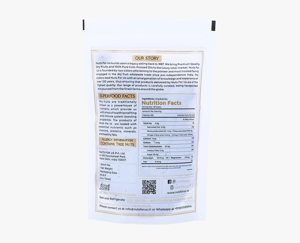 Nuts For Us Cranberries! Our 250-gram pack features a delightful mix of fresh red berries bursting with essential vitamins minerals and antioxidants. Rich in vitamin C fiber and phytonutrients these cranberries are perfect for supporting your overall health and well-being. Carefully selected from the finest sources our cranberries come in both white and golden varieties each offering its own unique flavor profile. Whether you prefer the tartness of white cranberries or the sweetness of golden cranberries you'll find something to satisfy your taste buds. Each batch is rigorously inspected and packaged to preserve its natural flavor and nutritional value ensuring a premium snacking experience that's both delicious and nutritious!