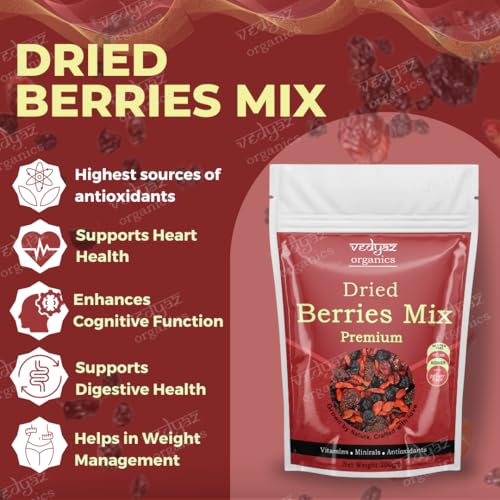 Vedyaz Organics Berries Mix Contains 4 Naturally Dehydrated Berries (Blueberry Goji Berries Strawberry & Sliced Cranberries) which are rich in Vitamin K C and antioxidants and have a good amount of fiber. This Berry Mix can be added to your Oatmeal Salads. Also you can you them while baking and making shakes or smoothies.