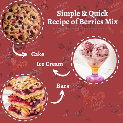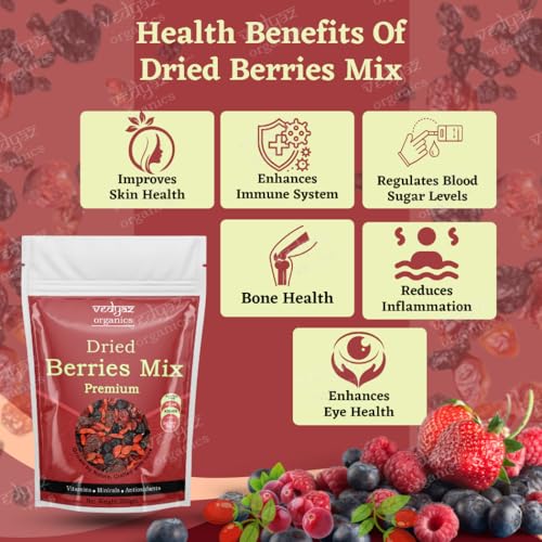 Vedyaz Organics Berries Mix Contains 4 Naturally Dehydrated Berries (Blueberry Goji Berries Strawberry & Sliced Cranberries) which are rich in Vitamin K C and antioxidants and have a good amount of fiber. This Berry Mix can be added to your Oatmeal Salads. Also you can you them while baking and making shakes or smoothies.