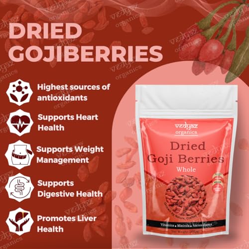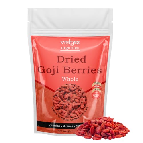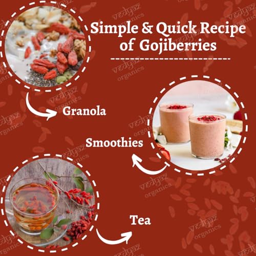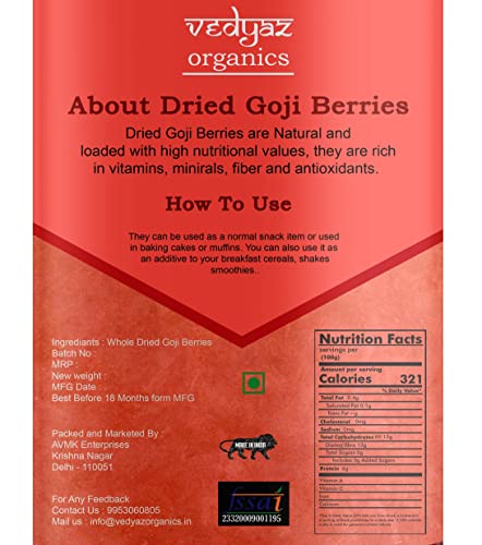 Vedyaz Organics whole dried goji berries are 100% natural and free from artificial color and flavoring