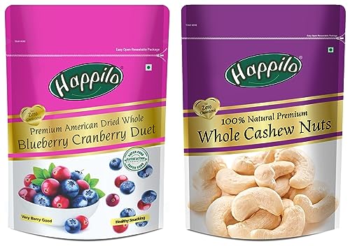 Happilo 100% Natural Premium Whole Cashews 200gOur cashews are a real treat. These are the best nuts you can ever find. They are delightfully rich and tasty a nutritious treat that will make a great snack time.Happilo Premium Dried Whole Blueberry Cranberry Duet 200gHappily has travelled the world to get the finest gourmet dry fruits dried fruits nuts berries and dates 100 percent natural and authentic. Indulge into the gourmet and grocery world of Happily with awesome natural nuts and dry fruits along with the unique dry fruit mixes fusions and flavoured dry fruits healthy seeds and dried berries specially crafted for your taste and health. Happily dry fruit gift boxes and festive dry fruits and nuts gift pack brings health happiness and love to gift to your colleagues friends and family. We bring you the taste and health together in single pack in the finest of packing packed in an art of the state facility certified by all majors like fssai iso. Every Happily pack is a perfect dry fruits gift for every festive occasion.