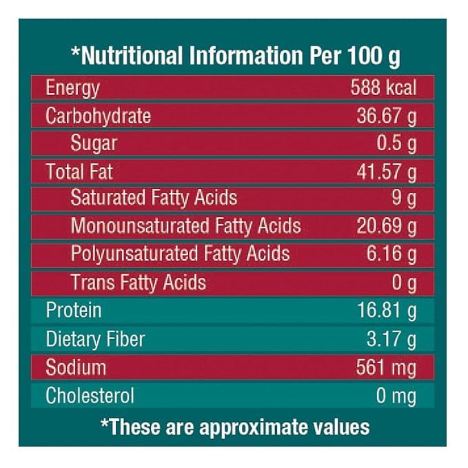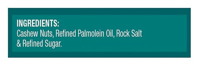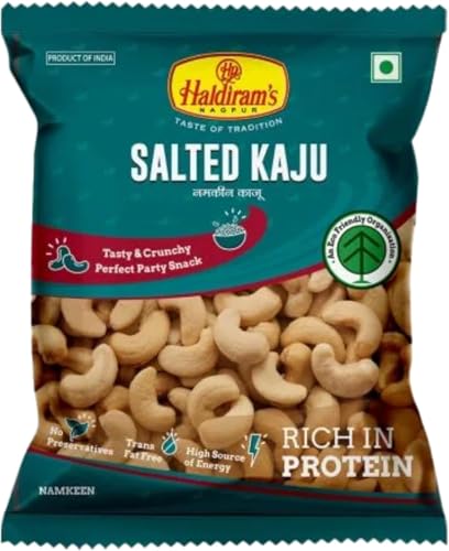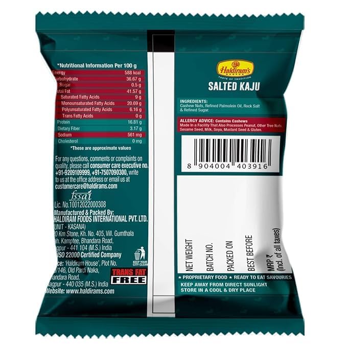 Haldirams Salted Kaju 40 g m x 3 Nutritional Values Per 100G : 1. Energy : 675.4 Kcal 2. Carbohydrate : 30.7 G 3. Sugar : 0 G 4. Total Fat : 56.2 G 5. Saturated Fatty Acids : 24.84 G 6. Monounsaturated Fatty Acids : 19.83 G 7. Polyunsaturated Fatty Acids