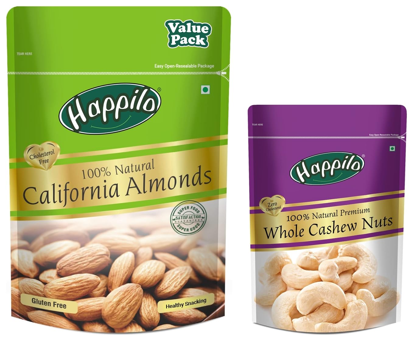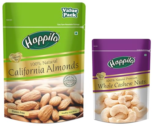 Happilo 100% Natural Premium California Dried Almonds 500g Pack Pouch | Premium Badam Giri | High in Fiber & Boost Immunity | Real Nuts | Gluten FreePerfect for a health snack. Time to be happy lovely & healthy. Gluten free High in protein Almonds High protein dietary fiber no gluten no GMO zero transfat zero cholesterol 100% Real nuts- good for an active lifestyle Lowers harmful cholesterol levels Rich source of omega-3 anti oxidants & vitamins calcium iron & magnesium Hearts best friend improves cardiovascular systemHappilo 100% Natural Premium Whole Cashews 200 g (Pack of 1)Happilo has travelled the world to get the finest gourmet dry fruits Cashews are a real treat. These are the best nuts you can ever find. They are delightfully rich and tasty a nutritious treat that will make a great snack time.