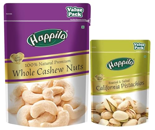 Happilo 100% Natural & Crunchy Premium Whole Cashews Nutritious & Delicious Nuts Signature Plain High Fiber Rich In Protein 1 kg Pack of 1Happilo 100% Natural Premium Californian King Size Cashew 100% Real nuts- good for an active life style It's High in Protein Dietary Fiber Gluten Free Non-GMO Zero Trans Fat & Zero Cholesterol. A pack of nut that prepares you for a power packed day ahead. Happilo Zip Lock Pouch with airtight seal to ensure the product is protected and fresh. Quality assured - Happilo products are rigorously tested against the industry's best quality standardsHappilo Premium Californian Roasted & Salted Pistachios 500 gms Value Pack | Pista Dry Fruit Shelled Nuts Super Crunchy & Delicious Healthy Snack | Vitamins & Minerals RichHappilo has travelled the world to get the finest gourmet dry fruits Pistachios are a wonderful fun and tasty snack which are lightly salted. Crack open the shells to treat your taste buds for a snacking sensation.