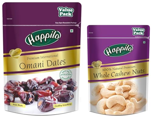 Happilo 100% Natural Premium Whole Cashews 500 g Value Pack | Whole Crunchy Cashew | Premium Kaju nuts | Nutritious & Delicious | Gluten Free & Plant based ProteinHappilo has travelled the world to get the finest gourmet dry fruits Cashews are a real treat. These are the best nuts you can ever find. They are delightfully rich and tasty a nutritious treat that will make a great snack time.Happilo Premium International Omani Dates 680g Value Pack | Khajoor or Khajur Dry Fruit | Healthy & Nutritious Snack | Rich in Protein & Vitamins | Natural SweetnerHappilo omani dates also known as khajoor are one of worlds most delicious farm fresh dates. Omani dates have the hidden quality of boosting energy instantly! Hence they are not just apt during festive season but are also a must-have snack for the entire year. It is superfood for super energy levels. Our products are packed under highest level of hygiene retaining all the goodness of nature.