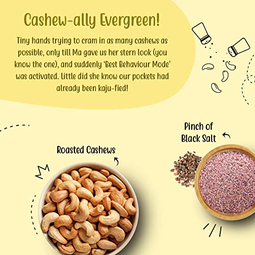 "As mostly content beings who love the slow pace of life - a good book a rainy day under a warm duvet a steaming cuppa chai we can't exactly relate to being called salty' which is millennial speak for resentful or irritated. In a case of delicious irony we absolutely love our snacks to be just that perfectly salty! Especially if they are superior quality Kaju roasted with black salt *chefs kiss*. The kind of healthy snack that's as perfect with chai time as it is as Happy Hour chakna'! Not only are they a smart snacking option they also kajually (get it?) yum!"