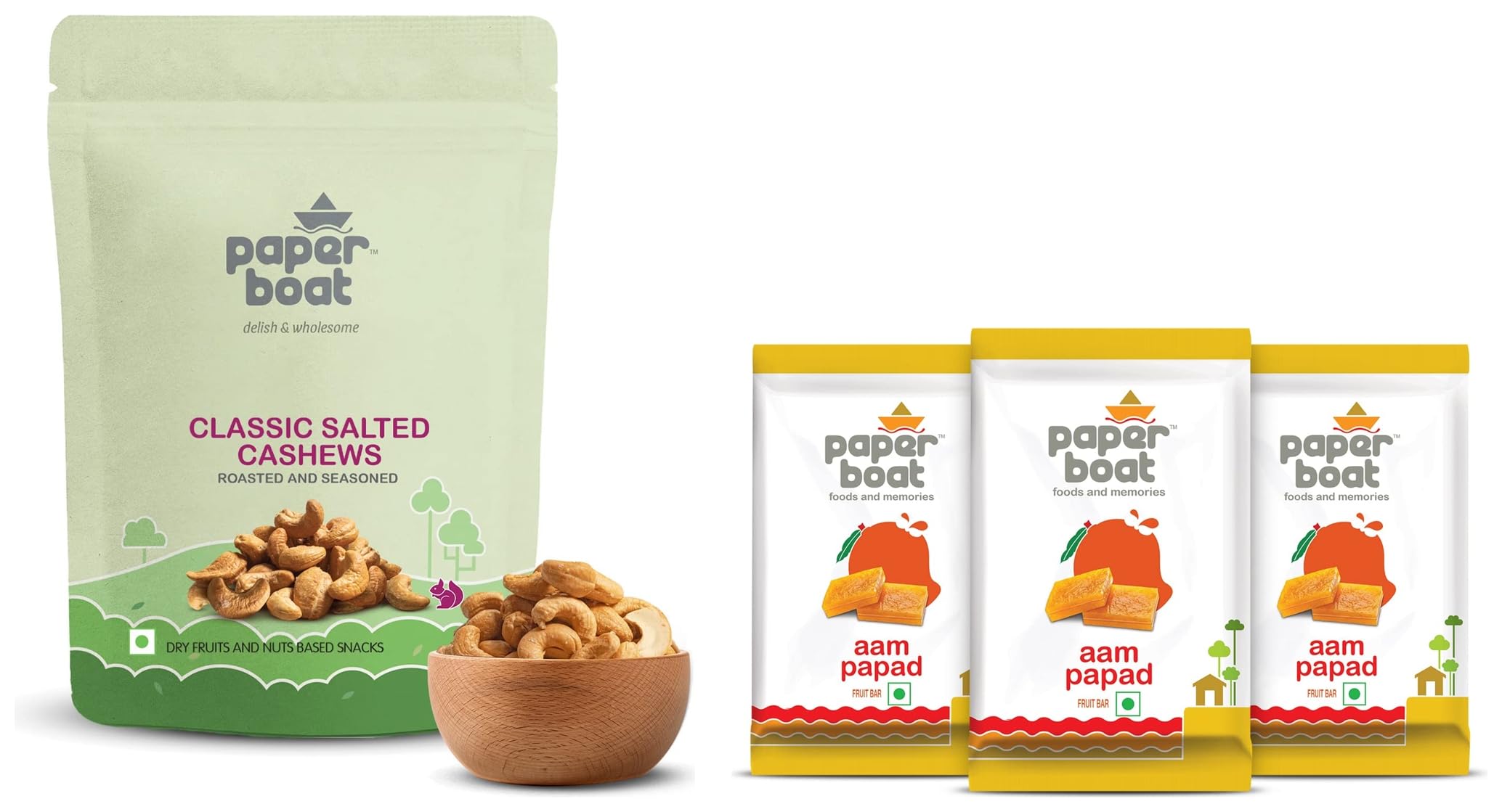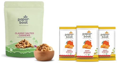 Paper Boat Classic Salted Cashews 200g | Freshly Roasted"As mostly content beings who love the slow pace of life - a good book a rainy day under a warm duvet a steaming cuppa chai we can't exactly relate to being called salty' which is millennial speak for resentful or irritated. In a case of delicious irony we absolutely love our snacks to be just that perfectly salty! Especially if they are superior quality Kaju roasted with black salt *chefs kiss*. The kind of healthy snack that's as perfect with chai time as it is as Happy Hour chakna'! Not only are they a smart snacking option they also kajually (get it?) yum!"Paper Boat Aam Papad Family Pack Fruit Bar No Added Preservatives and Colours (Pack of 3 90g Each)Every summer afternoon when Maa would sleep tired after half a day's zillion duties we would surreptitiously tip toe into the kitchen for a little after-lunch snack. The cool tile flooring masking the sound of us acting like plundering bandits in our own home looking for the infamous steel dabba. We'll never forget this one particular afternoon when Maa caught us stealing masala and Aam Papad red handed. Since this wasn't the first time we were expecting things to get ugly but instead she too sat with us on the floor and demanded her share. We were all complicit here! As we ate that tangy sweet treat we saw a fun rule breaker side to our mother that's forever etched in our hearts. Guess Aam Papad brings out the child in everyone!