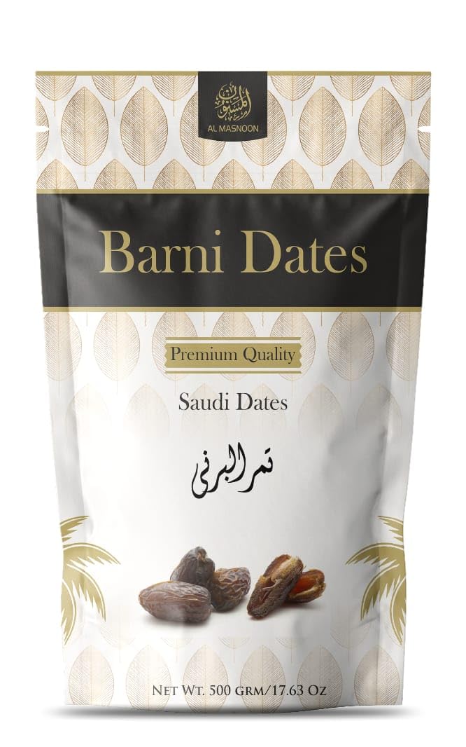 AL MASNOON Barni Dates are a delicious and nutritious treat sourced directly from Saudi Arabia presented in a convenient 500g pack. Known for their rich flavor and natural sweetness Barni dates are a popular choice for snacking and culinary uses. These dates are soft and succulent offering a delightful chewy texture that makes them perfect for enjoying on their own or incorporating into various dishes. Packed with essential nutrients including fiber vitamins and minerals Barni dates are an excellent energy booster and a healthy addition to your diet. Ideal for adding to smoothies salads or baked goods they can also be used in savory dishes or enjoyed as a natural sweetener in desserts. With their rich cultural heritage and numerous health benefits AL MASNOON Barni Dates are not only a tasty indulgence but also a wholesome choice for any occasion. Enjoy the authentic taste of Saudi Arabia with every bite!