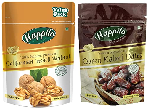 Happilo Premium 100% Natural Californian Inshell Walnut Kernels Value Pack PouchRaw 500gWalnuts are deliciously healthy and great for snacking baking or cooking. These in shell raw walnut halves are mainly grown in California and northern India. Eating raw walnuts is one of the easiest things to do to improve your health.Happily has travelled the world to get the finest gourmet dry fruits dried fruits nuts berries and dates. Indulge into the gourmet and grocery world of Happily with awesome nuts and dry fruits along with the unique dry fruit mixes fusions and flavoured dry fruits healthy seeds and dried berries specially crafted for your taste and health. Happilo dry fruit gift boxes and festive dry fruits and nuts gift pack brings health happiness and love to gift to your colleagues friends and family. We bring you the taste and health together in single pack in the finest of packing packed in an art of the state facility certified by all majors like fssai iso. Every Happily pack is a perfect dry fruits gift for every festive occasion.Happilo Premium International Queen Kalmi Dates 200g (Pack of 2)Happilo has travelled the world to get the finest gourmet dry fruits. They are one of the most nutritious dried fruits in the world they're a yummy healthy snack. Great for Snacking adding to Cereal Cooking and Baking. High Antioxidants Dietary Fiber No Gluten Non GMO Zero Trans Fat & Zero Cholesterol. Daily need products for a healthy and energetic life. Happilo Zip Lock Pouch with airtight seal to ensure the product is protected and fresh. Quality assured - Happilo products are rigorously tested against the industry's best quality standards.