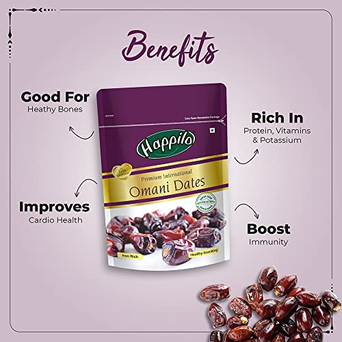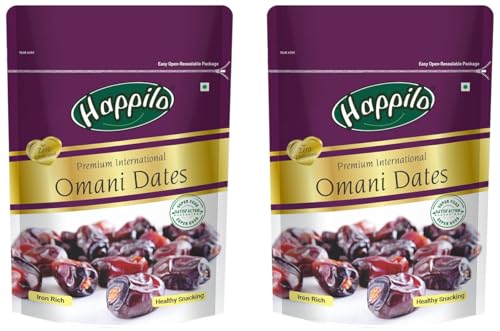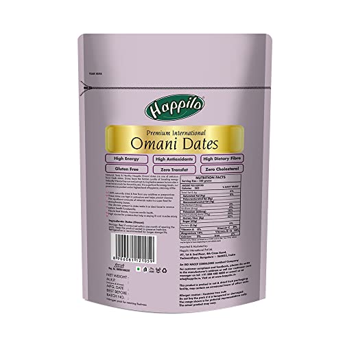 Sourced from Oman Happilos Omani Dates are deliciously nutrient dense and are full of vitamins minerals and antioxidants. Quality Guaranteed as it has been packed under a strict level of hygiene retaining its taste and goodness.