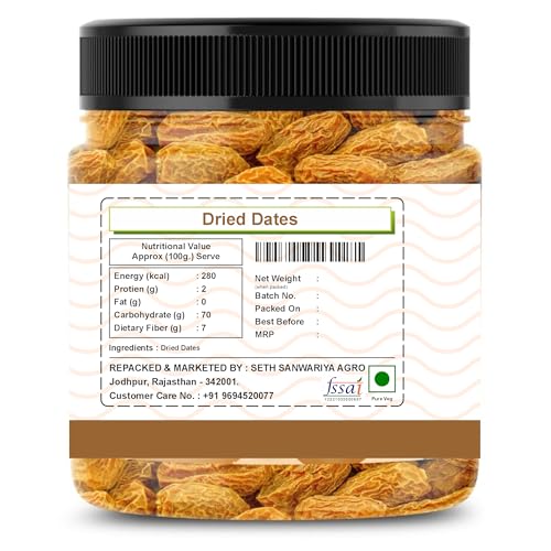 Discover the natural sweetness of SeasonalKart's premium Dried Dates (Sukha Khajoor) a nutritious snacking option packed with wholesome goodness. These carefully selected dates are rich in dietary fibre (7g per 100g) and provide a natural energy boost with 280 kcal per 100g serving. Each date offers a perfect balance of nutrients including 2g of protein and 70g of carbohydrates per 100g making them an ideal choice for health-conscious individuals. The dates come in a convenient storage jar with a secure lid to maintain freshness. Perfect for direct consumption these traditional dried dates can also enhance desserts smoothies and traditional Indian sweets. Their naturally sweet flavour and chewy texture make them a delightful alternative to processed snacks. Whether you're looking for a quick energy boost during work a pre-workout snack or a healthy addition to your daily diet these premium quality dates are an excellent choice. Store in a cool dry place to maintain optimal freshness.
