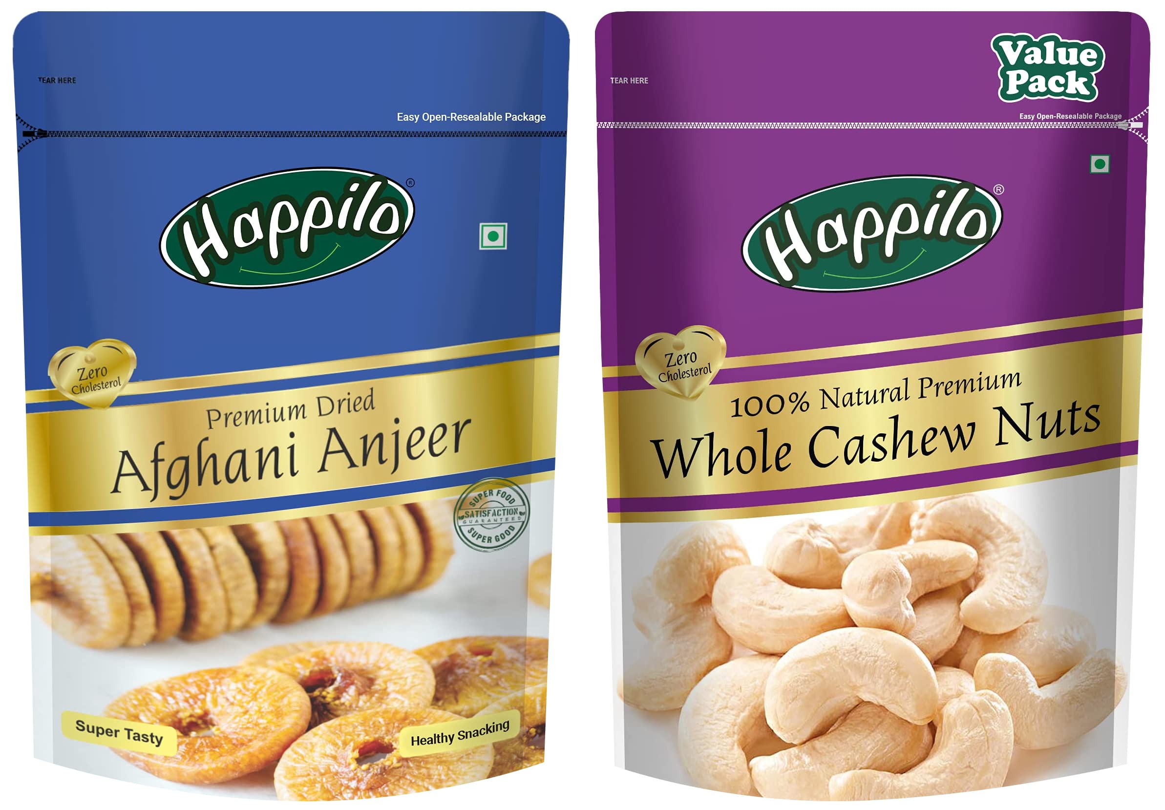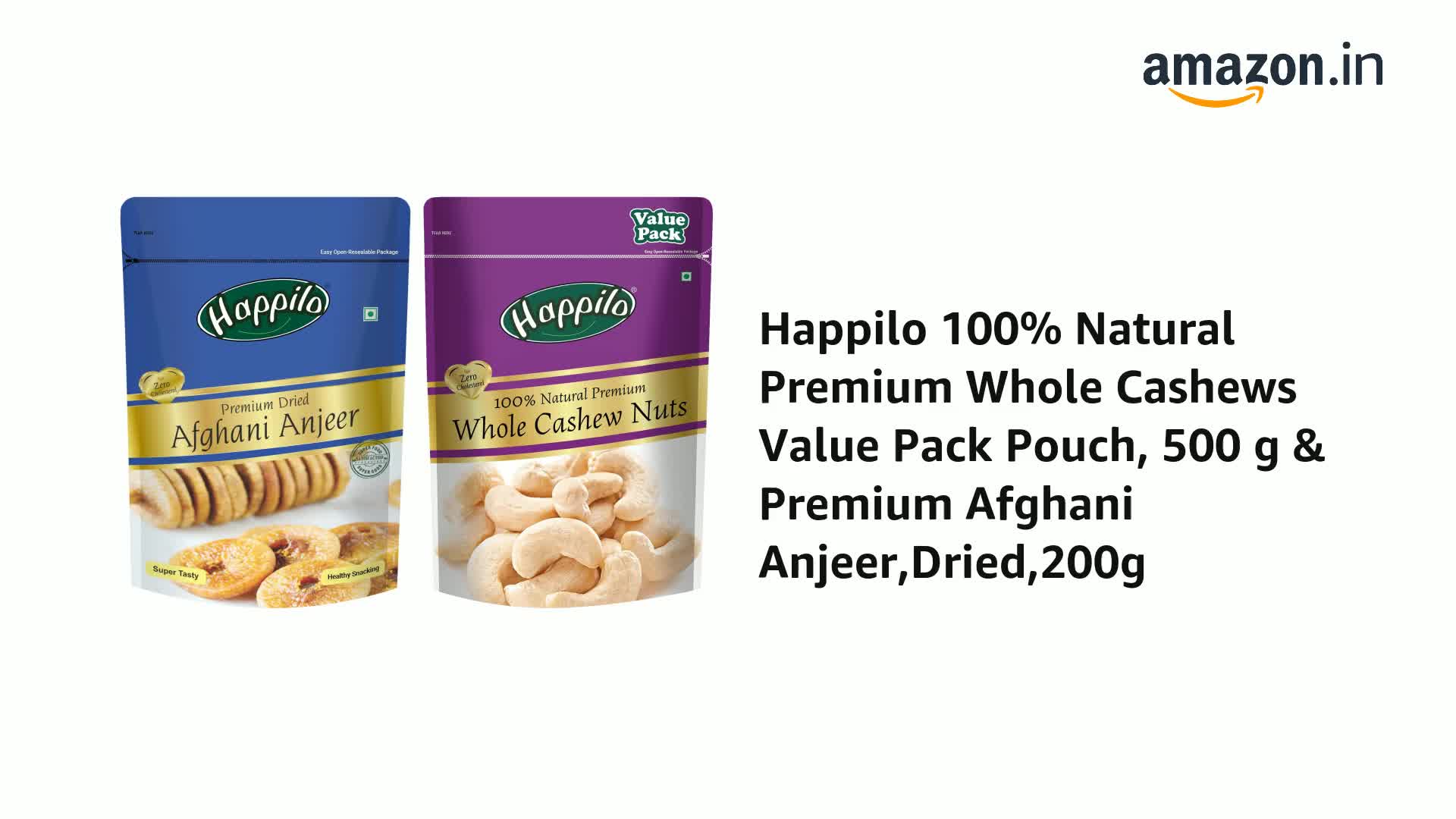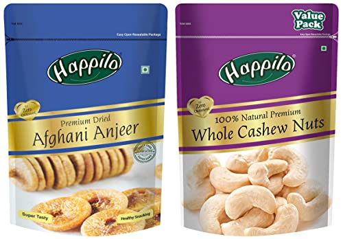 Happilo 100% Natural Premium Whole Cashews Value Pack Pouch 500 gHappilo has travelled the world to get the finest gourmet dry fruits Cashews are a real treat. These are the best nuts you can ever find. They are delightfully rich and tasty a nutritious treat that will make a great snack time.Happilo Premium Afghani AnjeerDried200gAfghani anjeer known for their creamy sweet and indulgent taste- They are also packed with nutritional goodness making them one of the healthiest dried fruit. Eating these amazing snack can keep the hunger pangs at bay.