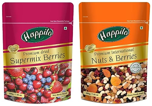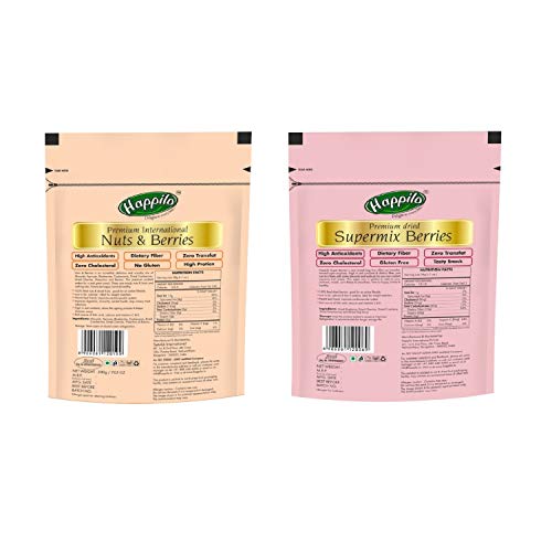 Happilo nuts & berries is incredibly delicious and crunchy mix of almonds apricots blueberries dried cranberries dried cherries pistachios and raisins. This premium cocktail makes for a real great snack. Happily super mix berries is a high protein pack with all mixed berries packed. This Happilo healthy pack is a combination of dry fruits which give you your daily intake of nutrients. Time to be happy lovely and healthy. Our Happilo brand is committed in improving the quality of your life Happilo provides food that is packed with the goodness of nature and taste that will keep you wanting for more.