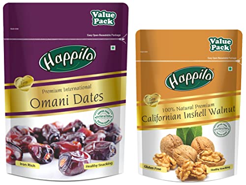 Happilo Premium International Omani Dates Value Pack Pouch 680gHappilo omani dates also known as khajoor are one of worlds most delicious farm fresh dates. Omani dates have the hidden quality of boosting energy instantly! Hence they are not just apt during festive season but are also a must-have snack for the entire year. It is superfood for super energy levels. Our products are packed under highest level of hygiene retaining all the goodness of nature.Happilo Premium 100% Natural Californian Inshell Walnut Kernels Value Pack PouchRaw 500gWalnuts are deliciously healthy and great for snacking baking or cooking. These in shell raw walnut halves are mainly grown in California and northern India. Eating raw walnuts is one of the easiest things to do to improve your health.Happily has travelled the world to get the finest gourmet dry fruits dried fruits nuts berries and dates. Indulge into the gourmet and grocery world of Happily with awesome nuts and dry fruits along with the unique dry fruit mixes fusions and flavoured dry fruits healthy seeds and dried berries specially crafted for your taste and health. Happilo dry fruit gift boxes and festive dry fruits and nuts gift pack brings health happiness and love to gift to your colleagues friends and family. We bring you the taste and health together in single pack in the finest of packing packed in an art of the state facility certified by all majors like fssai iso. Every Happily pack is a perfect dry fruits gift for every festive occasion.