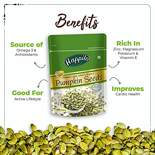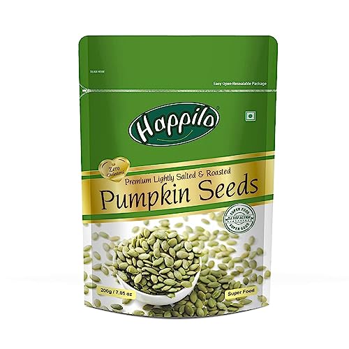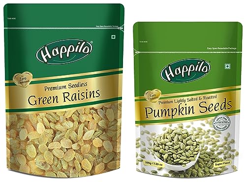 Happilo Premium Seedless Green Raisins 250gHappilo has travelled the world to get the finest gourmet dry fruits. They are one of the most nutritious dried fruits in the world they're a yummy healthy snack. Great for Snacking adding to Cereal Cooking and Baking. High Antioxidants Dietary Fiber No Gluten Non GMO Zero Trans Fat & Zero Cholesterol. Daily need products for a healthy and energetic life. Happilo Zip Lock Pouch with airtight seal to ensure the product is protected and fresh. Quality assured - Happilo products are rigorously tested against the industry's best quality standards.Happilo Premium Roasted Pumpkin Seeds for Eating 200g Lightly Salted for Healthy Diet Immunity Booster and Fiber Rich SuperfoodHappilo has travelled the world to get the finest gourmet dry fruits dried fruits nuts berries and dates. Indulge into the gourmet and grocery world of Happily with awesome natural nuts and dry fruits along with the unique dry fruit mixes fusions and flavoured dry fruits healthy seeds and dried berries specially crafted for your taste and health.