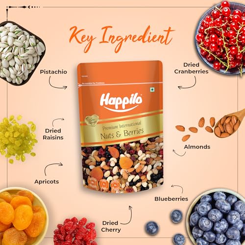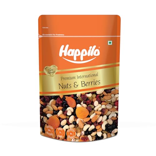 Nuts and Berries is an incredibly delicious and crunchy mix of Almonds Apricots Blueberries Cashew nuts Dried Cranberries Dried Cherries Pistachios and Raisins. This premium cocktail makes for a real great snack. These are simply nuts and fruits and nothing else. Time to be Happy Lovely and Healthy.