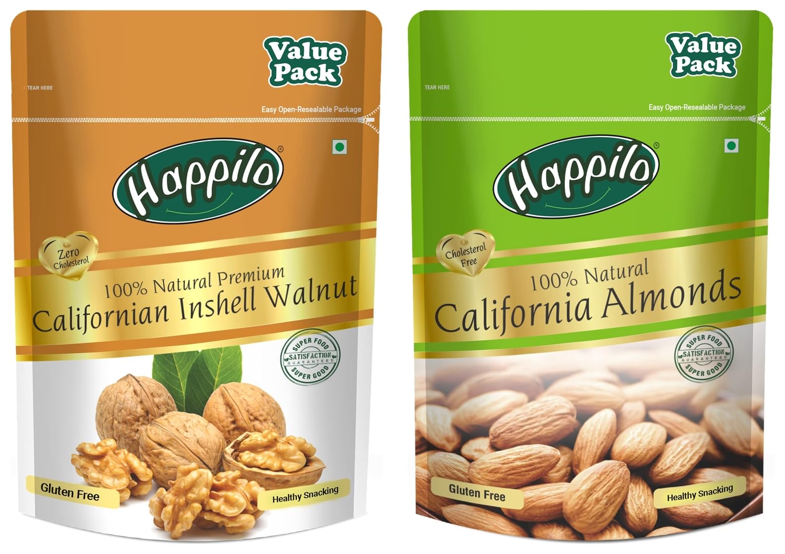 100% Natural Premium Californian Almonds Value Pack Pouch 500 gHas Travelled The World To Get The Finest Gourmet Dry Fruits Perfect For A Healthy Lifestyle.Time To Be Happy Lovely & Healthy.High Protein Dietary Fiber No Gluten No Gmo Zero Transfat Zero Cholesterol 100% Real Nuts- Good For An Active Lifestyle Lowers Harmful Cholesterol Levels Rich Source Of Omega-3 Anti Oxidants & Vitamins Calcium Iron & Magnesium. Shelf Life : 12 MonthsPremium 100% Natural Californian Inshell Walnut Kernels Value Pack Pouch 500 gWalnuts are deliciously healthy and great for snacking baking or cooking. These in shell raw walnut halves are mainly grown in California and northern India. Eating raw walnuts is one of the easiest things to do to improve your health.Happily has travelled the world to get the finest gourmet dry fruits dried fruits nuts berries and dates. Indulge into the gourmet and grocery world of Happily with awesome nuts and dry fruits along with the unique dry fruit mixes fusions and flavoured dry fruits healthy seeds and dried berries specially crafted for your taste and health. dry fruit gift boxes and festive dry fruits and nuts gift pack brings health happiness and love to gift to your colleagues friends and family. We bring you the taste and health together in single pack in the finest of packing packed in an art of the state facility certified by all majors like fssai iso. Every Happily pack is a perfect dry fruits gift for every festive occasion.