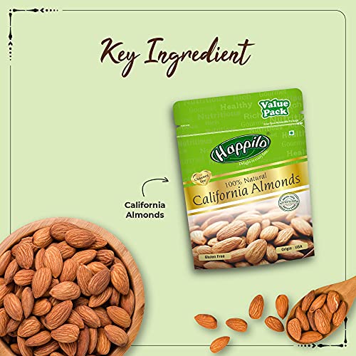 100% Natural Premium Californian Almonds Value Pack Pouch 500 gHas Travelled The World To Get The Finest Gourmet Dry Fruits Perfect For A Healthy Lifestyle.Time To Be Happy Lovely & Healthy.High Protein Dietary Fiber No Gluten No Gmo Zero Transfat Zero Cholesterol 100% Real Nuts- Good For An Active Lifestyle Lowers Harmful Cholesterol Levels Rich Source Of Omega-3 Anti Oxidants & Vitamins Calcium Iron & Magnesium. Shelf Life : 12 MonthsPremium Seedless Raisins 250g (Pack of 2)has travelled the world to get the finest gourmet dry fruits dried fruits nuts berries and dates 100 percent natural and authentic. Indulge into the gourmet and grocery world of Happily with awesome natural nuts and dry fruits along with the unique dry fruit mixes fusions and flavoured dry fruits healthy seeds and dried berries specially crafted for your taste and health. Happily dry fruit gift boxes and festive dry fruits and nuts gift pack brings health happiness and love to gift to your colleagues friends and family. We bring you the taste and health together in single pack in the finest of packing packed in an art of the state facility certified by all majors like fssai iso. Every Happily pack is a perfect dry fruits gift for every festive occasion.