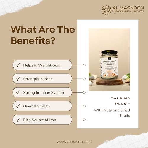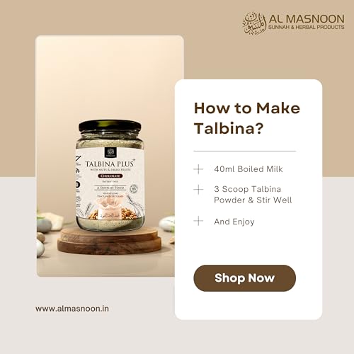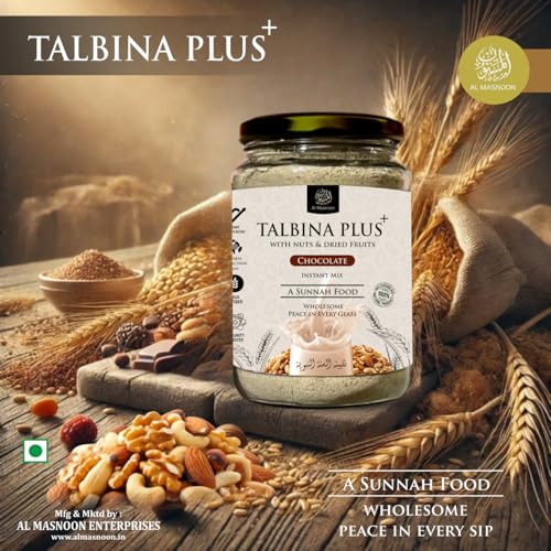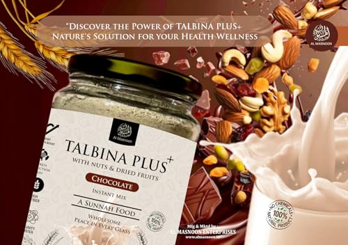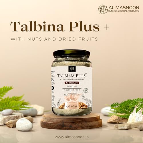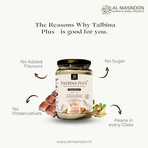 Discover the perfect harmony of tradition and indulgence with Al Masnoon Talbina Plus Instant Mix enriched with nuts dried fruits and natural chocolate. This 350g pack delivers a deliciously wholesome blend that brings a touch of peace and nourishment to every sip.