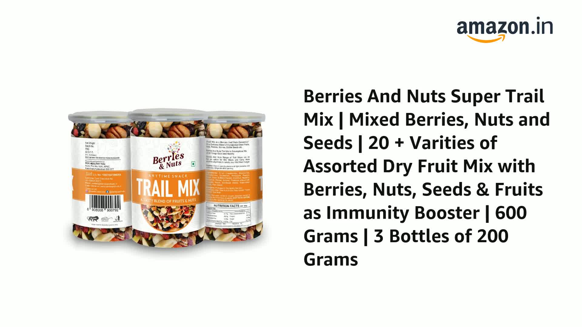 Berries And Nuts Super Trail Mix | Mixed Berries, Nuts and Seeds | 20 + Varities of Assorted Dry Fruit Mix with Berries, Nuts, Seeds & Fruits as Immunity Booster | 600 Grams | 3 Bottles of 200 Grams