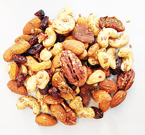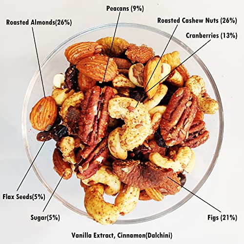 INGREDIENTS: Roasted Almonds (26%) Roasted Cashews Nuts (26%) Dried Cranberries (13%) Dry Figs(21%) Flax Seeds(5%)