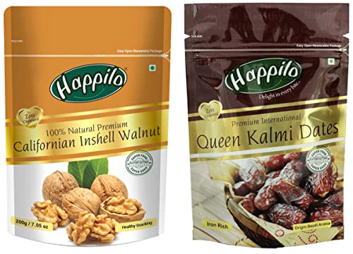Happilo Natural Premium Californian Inshell Dried Walnuts 200gWalnuts are deliciously healthy & great for snacking baking or cooking. These with shell raw walnut halves are mainly grown in California and Northern India. Eating raw walnuts is one of the easiest things to do to improve your health. Gluten free High in protein Walnuts High protein dietary fiber no gluten no GMO zero trans-fat zero cholesterol 100% natural nuts: Good for an active lifestyle perfect for snacking Low calorie nut low sodium ideal for weight watchers High in anti oxidants slows the ageing process & keeps diseases away Reduces the risk for heart disease cancer stroke diabetes high BP & obesityHappilo Premium International Queen Kalmi Dates 200g (Pack of 2)Happilo has travelled the world to get the finest gourmet dry fruits. They are one of the most nutritious dried fruits in the world they're a yummy healthy snack. Great for Snacking adding to Cereal Cooking and Baking. High Antioxidants Dietary Fiber No Gluten Non GMO Zero Trans Fat & Zero Cholesterol. Daily need products for a healthy and energetic life. Happilo Zip Lock Pouch with airtight seal to ensure the product is protected and fresh. Quality assured - Happilo products are rigorously tested against the industry's best quality standards.