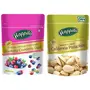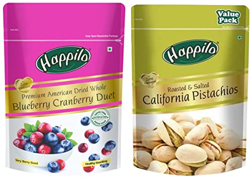 Happilo Premium Californian Roasted & Salted Pistachios Value Pack Pouch 500 gHappilo has travelled the world to get the finest gourmet dry fruits Pistachios are a wonderful fun and tasty snack which are lightly salted. Crack open the shells to treat your taste buds for a snacking sensation.Happilo Premium American Dried Whole Blueberry Cranberry Duet 200gHappily has travelled the world to get the finest gourmet dry fruits dried fruits nuts berries and dates 100 percent natural and authentic. Indulge into the gourmet and grocery world of Happily with awesome natural nuts and dry fruits along with the unique dry fruit mixes fusions and flavoured dry fruits healthy seeds and dried berries specially crafted for your taste and health. Happily dry fruit gift boxes and festive dry fruits and nuts gift pack brings health happiness and love to gift to your colleagues friends and family. We bring you the taste and health together in single pack in the finest of packing packed in an art of the state facility certified by all majors like fssai iso. Every Happily pack is a perfect dry fruits gift for every festive occasion.
