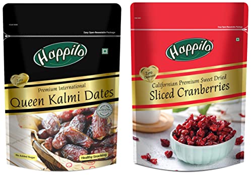 Happilo Premium International fresh Queen Kalmi Dates 200gmHappilo has travelled the world to get the finest gourmet dry fruits. They are one of the most nutritious dried fruits in the world they're a yummy healthy snack. Great for Snacking adding to Cereal Cooking and Baking. High Antioxidants Dietary Fiber No Gluten Non GMO Zero Trans Fat & Zero Cholesterol. Daily need products for a healthy and energetic life. Happilo Zip Lock Pouch with airtight seal to ensure the product is protected and fresh. Quality assured - Happilo products are rigorously tested against the industry's best quality standards.Happilo Premium Californian Dried and Sweet Sliced Cranberries 200 gSurprise your taste buds with the delicious taste of Sweet cranberries. It is perfect for snacking baking mixing into cereal muffins smoothies etc.