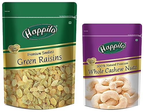 100% Natural Premium Whole Cashews 200gOur cashews are a real treat. These are the best nuts you can ever find. They are delightfully rich and tasty a nutritious treat that will make a great snack time.Premium Seedless Green Raisins 250gRaisins are the original candy- nature's candy. They are one of the most nutritious dried fruits in the world. famous for their sweetness so they're a yummy healthy snack. These are out of this world. They have double the deliciousness of ordinary raisins. Great for snacking adding to cereal cooking and baking.