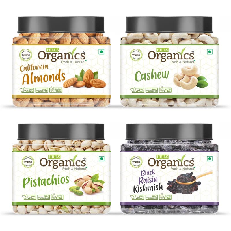 HILLS ORGANICS Dry fruits like Almonds Cashews Pistachios walnuts and Raisins Dates and Apricots are traditionally known to be the powerhouse of nutrients. Get the daily nutrient needs to be fulfilled with a Mixed Dry Fruits combo pack at a single place HILLS ORGANICS brand provides different kinds of Dry Fruits Combo Packs Which are hygienically packed - ALMONDS - They lower LDL (bad) cholesterol and are packed with vitamin E magnesium and potassium which helps oxygen and nutrients flow more freely through the blood. CASHEW -Cashew nuts are rich in healthy unsaturated fats and minerals like magnesium potassium and L-arginine. PISACHIOS - Pistachios are not only a good source of garnishing sweets but also makeup up one of the healthiest foods. They are nutrition pack powerhouses loaded with antioxidants. Pistachio contains a high amount of dietary fiber that can strengthen your digestive tract. Pistachios are rich in dietary fibers and proteins that may promote satiety and in turn help in weight loss. RAISINS - kishmish is rich in fiber and kishmish is good at controlling cholesterol levels. This in turn helps prevent heart disease. due to its fair amount of calcium magnesium and phosphorus. ANJEER - regular intake of anjeer can lower the triglyceride level in the blood which is useful for maintaining a good heart. Anjeer can also help reduce the chances of obesity. WALNUTS - There have multiple studies that prove the benefits of walnuts for brain functioning Super Plant Source of Omega-3s helps with the increased absorption of calcium in the body. APRICIT-Eat some Dried Apricots at least once in a day to stock up Vitamin K in your Body. DATES -Dates are the fruit of Date Palm tree. They are chewy with a sweet flavor. Dates are extremely nutritious and contain several vitamins and minerals in addition to fibre and antioxidants.