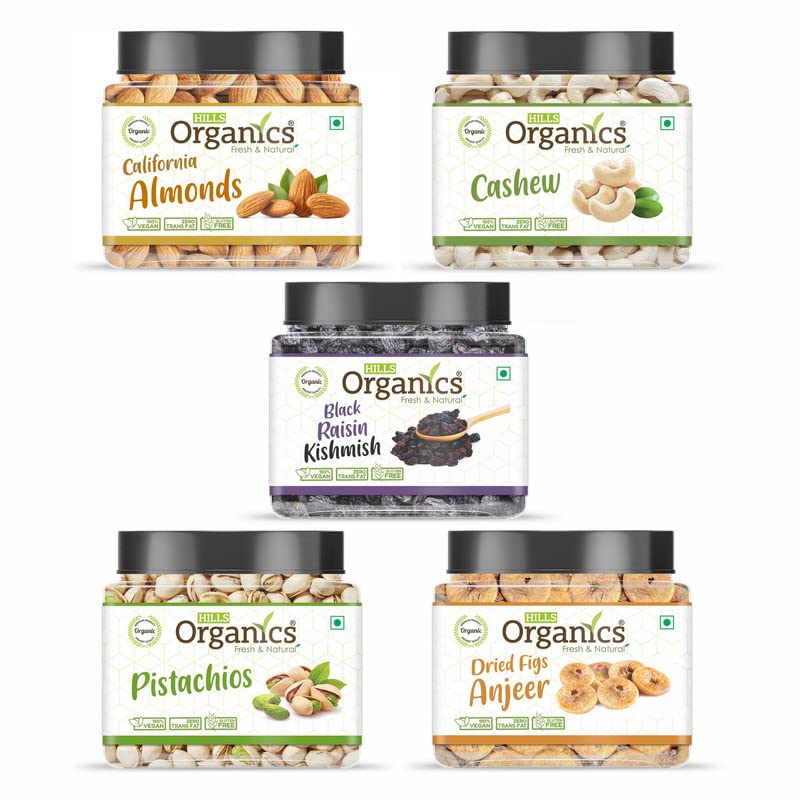 HILLS ORGANICS Dry Fruits Combo Pack - 500G | AlmondsCashew PistachiosDried Figs Anjeer Black Raisin - 100G Each