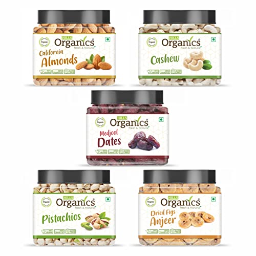 HILLS ORGANICS Dry Fruits Combo Pack - 500G | AlmondsCashew PistachiosDried Figs Anjeer Medjoul Dates - 100G Each