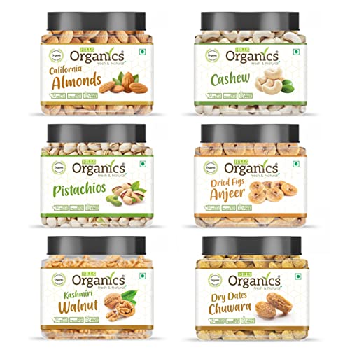 HILLS ORGANICS Dry fruits like Almonds Cashews Pistachios walnuts and Raisins Dates and Apricots are traditionally known to be the powerhouse of nutrients. Get the daily nutrient needs to be fulfilled with a Mixed Dry Fruits combo pack at a single place HILLS ORGANICS brand provides different kinds of Dry Fruits Combo Packs Which are hygienically packed - ALMONDS - They lower LDL (bad) cholesterol and are packed with vitamin E magnesium and potassium which helps oxygen and nutrients flow more freely through the blood. CASHEW -Cashew nuts are rich in healthy unsaturated fats and minerals like magnesium potassium and L-arginine. PISACHIOS - Pistachios are not only a good source of garnishing sweets but also makeup up one of the healthiest foods. They are nutrition pack powerhouses loaded with antioxidants. Pistachio contains a high amount of dietary fiber that can strengthen your digestive tract. Pistachios are rich in dietary fibers and proteins that may promote satiety and in turn help in weight loss. RAISINS - kishmish is rich in fiber and kishmish is good at controlling cholesterol levels. This in turn helps prevent heart disease. due to its fair amount of calcium magnesium and phosphorus. ANJEER - regular intake of anjeer can lower the triglyceride level in the blood which is useful for maintaining a good heart. Anjeer can also help reduce the chances of obesity. WALNUTS - There have multiple studies that prove the benefits of walnuts for brain functioning Super Plant Source of Omega-3s helps with the increased absorption of calcium in the body. APRICIT-Eat some Dried Apricots at least once in a day to stock up Vitamin K in your Body. DATES -Dates are the fruit of Date Palm tree. They are chewy with a sweet flavor. Dates are extremely nutritious and contain several vitamins and minerals in addition to fibre and antioxidants.