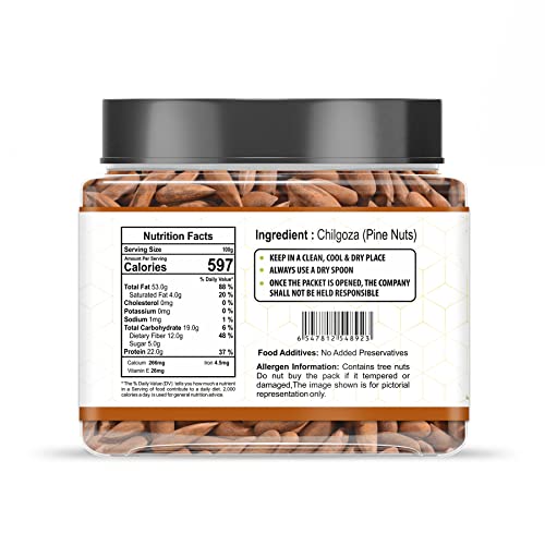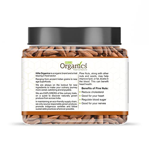 Hills Organics (Chilgoza) Pine nuts are small elongated nuts that come from the cones of certain pine tree species such as the stone pine which is native to Europe and Asia. They are often used in a variety of culinary applications due to their sweet buttery flavor and soft texture. Pine nuts are typically harvested by hand and then shelled to remove the hard outer shell that encases the creamy ivory-colored kernel inside. They are known for their rich nutritional profile containing high levels of protein healthy fats and essential minerals such as magnesium zinc and copper. Pine nuts are a versatile ingredient and can be used in a variety of dishes including salads pesto sauces baked goods and more. They are also commonly used in traditional Mediterranean and Middle Eastern cuisine where they are often toasted to bring out their natural sweetness and enhance their flavor. It's important to note that pine nuts can be quite expensive compared to other types of nuts but their unique flavor and nutritional benefits make them a worthwhile addition to any diet when consumed in moderation. Crunchy yet butter textured pleasantly sweet and delicious pine nuts are small edible seeds of female cone in a pine tree. Pine kernels are indeed very good source of plant derived nutrients essential minerals vitamins and "heart friendly" mono-unsaturated fatty acids that help benefit in reducing cholesterol levels in the blood.Pine nuts are rich in Vitamins A and lutein both of which are known to support sharper vision.Pine nuts build stronger bones thanks to their Vitamin D content.Pine nuts contain pinoleic acid which makes you feel fuller faster and thus aids in weight loss.They contain heart-friendly monounsaturated fat.Urban Platter - Simply Good Food!