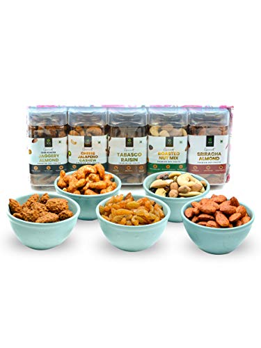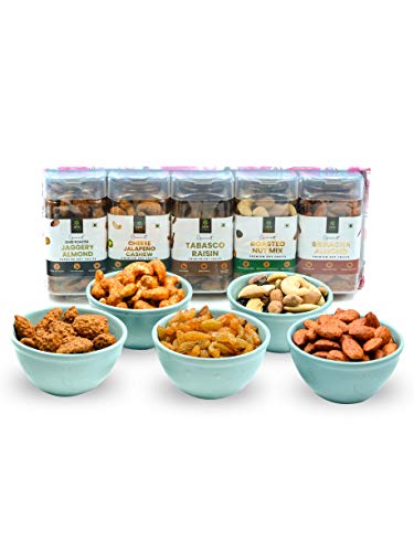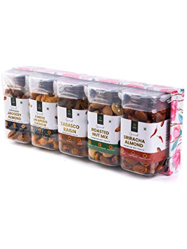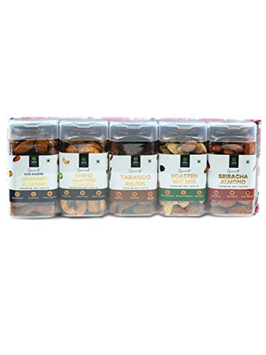 In the box: Cheese Jalapeno Cashew-100gms Tobasco Raisin-125gms Sriracha Almond -125gms Jaggery Almond-125gms Roasted Nut Mix-125gms
