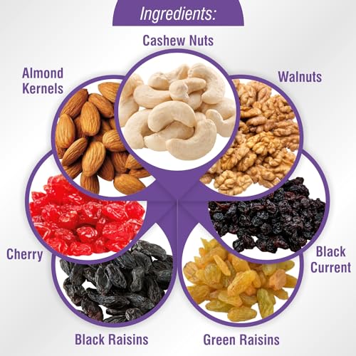 Made from nutritious and wholesome 7 Superfoods i.e. Almond Kernels Cashew Nuts Walnuts Red Cherry Black Current Black Raisins Green Raisins. Snack on it at any time! Whether it’s mid morning mid day or midnight hunger pangs! Top up on breakfast oatmeal bowls or yogurt. Add as an ingredient to make cakes granola bars breads. Taste- Fresh crunchy with a mix of a nutty and sweet texture.