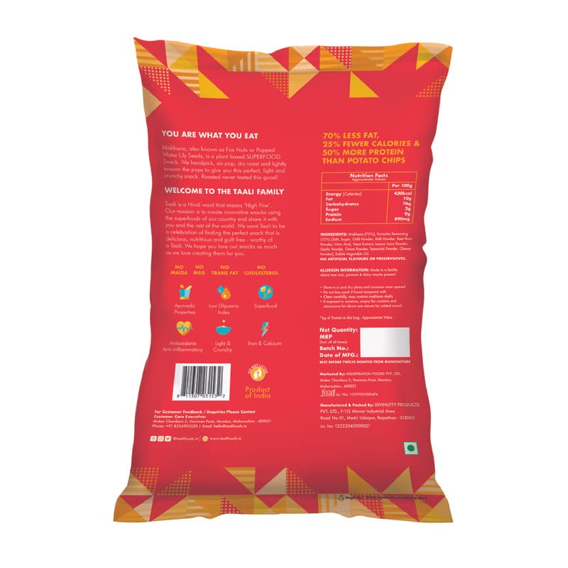 Variety of flavours: Gourmet Roasted Makhana in both Sweet and Savoury flavours? Yes you heard that right. Now enjoy your favourite SUPERFOOD snack in nine lip-smacking flavours: Sriracha Spice Ghee & Himalayan Pink Salt Tikka Masala Tangy Turmeric Pudina