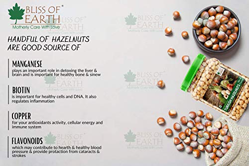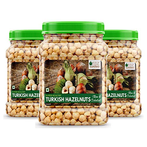 Bliss of Earth Turkish Hazelnuts are powder packed with nutrients including vitamins minerals anti-oxidants and healthy fats. Hazelnuts can be consumed as a raw snack roasted or added to baked dishes such as cake chocolates & shakes. All in all hazelnuts are an excellent and delicious source of nutrients for a healthy diet. Hazelnuts offers various health benefits including regulating blood pressure Direction for use: Consume raw roasted or salted. Add to your cake chocolates or shakes. Ingredients: Raw Dehulled Hazelnuts Country of Origin: Turkey
