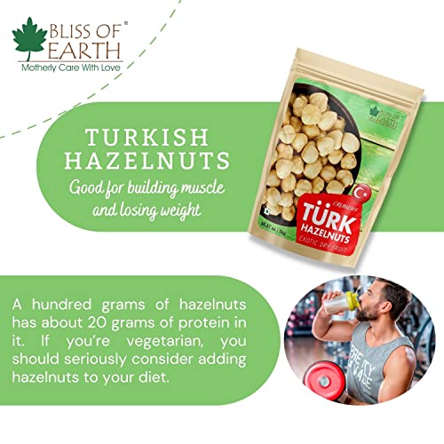 Bliss of Earth Turkish Hazelnuts are powder packed with nutrients including vitamins minerals anti-oxidants and healthy fats. Hazelnuts can be consumed as a raw snack roasted or added to baked dishes such as cake chocolates & shakes. All in all hazelnuts are an excellent and delicious source of nutrients for a healthy diet. Hazelnuts offers various health benefits including regulating blood pressure Direction for use: Consume raw roasted or salted. Add to your cake chocolates or shakes. Ingredients: Raw Dehulled Hazelnuts Country of Origin: Turkey