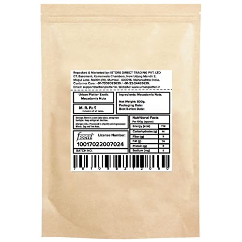 500 Grams - Macadamia Nuts - Healthy Exotic Filling Nuts!These nuts can be consumed as they are or with tea/ coffeeCan be roasted and salted to give oneself a delightful treatThey have the highest amount of beneficial mono unsaturated fats of any known nut. Thus they are considered great for patients with hyperemia and You can dip them in chocolate sauce and freeze to get yummy chocolate flavored macadamia nutsOnce opened refrigerate and use macadamia nuts within two months