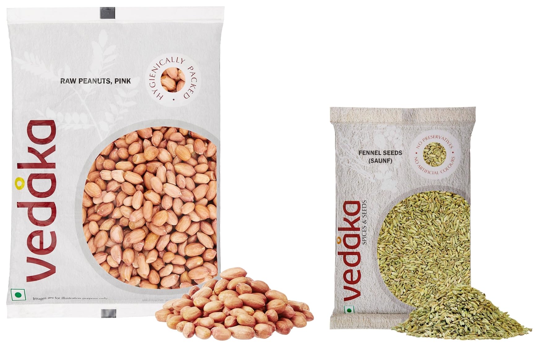 Vedaka Raw Peanuts Pink 1kgVedaka brings to you high-quality raw peanuts. Our peanuts are hygienically packed to retain goodness and undergo stringent and rigorous laboratory tests to meet fssai food safety norms. They contain no artificial flavours or preservatives.Vedaka Fennel Seeds (Saunf) 200gAll vedaka products are hygienically packed and undergo rigorous and stringent laboratory tests to meet food safety norms.
